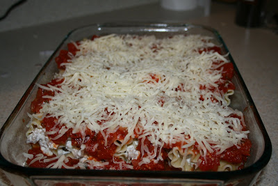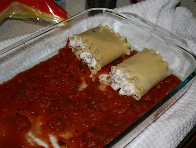 To assemble, line the bottom of a 13 by 9 inch lasagna pan with ¼ of marina sauce. Lay out a lasagna noodle on a work surface, and then spread 2 tablespoons of sausage and ricotta mixture evenly over the noodle. Start rolling the noodle at 1 end, then put about a 1 tablespoon more of the sausage and ricotta mixture and continue to roll the noodle.