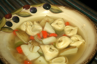 I have a few post for today. I have been saving them from this past week. I did not post anything last week. Mainly I was just lazy. Marc started a new job and he is getting up at ridicuously early hour, so by the end of the day he is exhausted. Unfortunately, his first day of work he was sick, really sick. I wanted to make some homemade soup for him, you know like some chicken noodle or veggie soup. I had some tortellinis in the fridge that I bought from the store that were stuffed with chicken and prosciutto. I was planing on making an cream sauce for the tortellinis, but with Marc not feeling well I thought they would be good in a chicken broth with some veggies. I used big chucks on potatoes, celery, onion and carrots, pretty much what ever you like in your soup, and let that cook before putting some herbs and spices in to the mix. I am not always able to use fresh herbs and spices, but I try to use them because food taste so much better. This is the first time I made soup with fresh herbs and spices and oh my it was so good. Such a big difference. After I got my broth and veggies just right I added the tortellinis, which don’t take long to cook, when they start to float and expand they are done.
