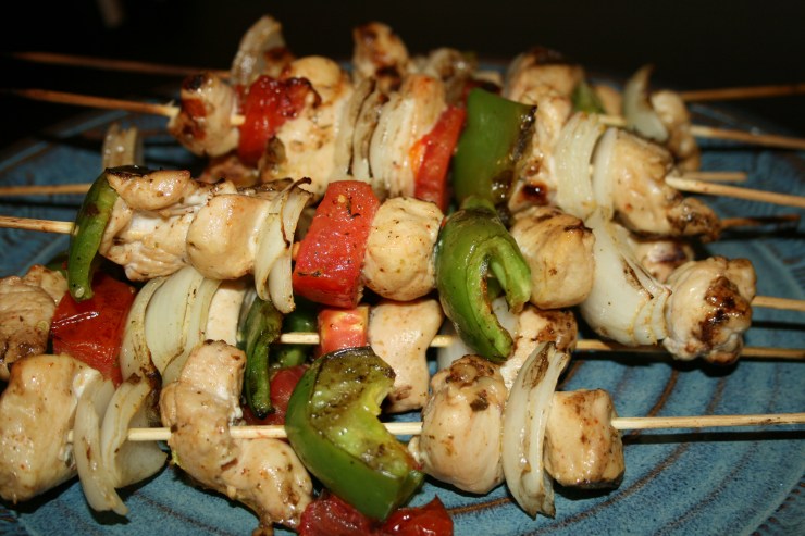 Last night for dinner though, it was time for the cobwebs to come off the grill. I decided to make some chicken kabobs with tomatoes, green peppers and onions. A few months ago I used a Tequila Lime marinade on some chicken for a salad and thought it would be perfect for my kabobs. I tossed the veggies in oil and some spices from the pantry and let all it soak up the flavor for about 45 minutes in the refrigerator. In the mean time my skewers were soaking in water so they wouldn’t burn up on the grill.